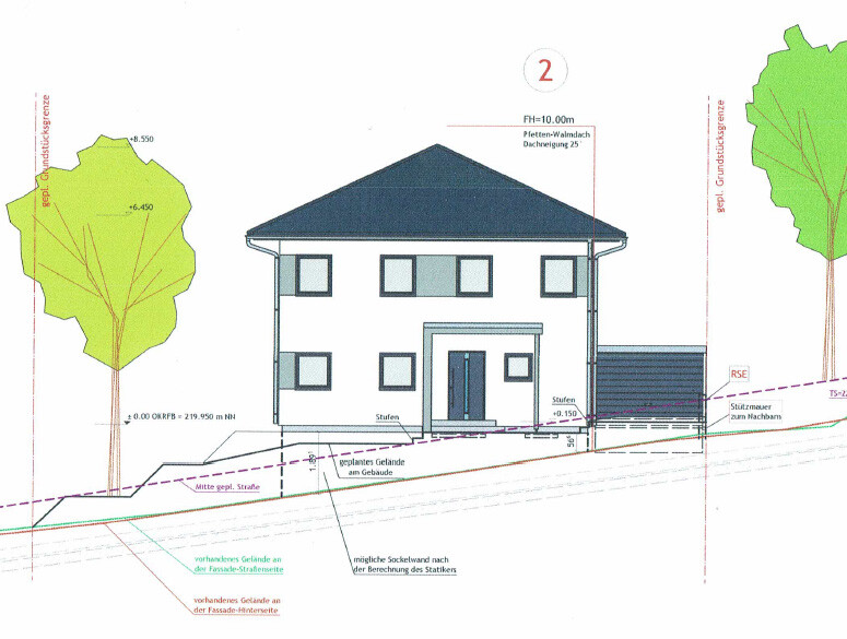 Das Problem ist u.a., dass die Straße (lila Linie im Anhang - grüne Linie: vorhandenes Gelände) im Vergleich zum jetzigen Gelände ca. 1m höher liegt. Wir haben die Möglichkeiten eines Kellers mit der Firma besprochen. Die Kosten waren ca. 80k nochmals teurer im Vergleich zum jetzigen Angebot. Andere Möglichkeit das Haus über das OG zu betreten und das UG in den Hang zu bauen, haben wir aus mehreren Gründen verworfen. 1. In ca. der Hälfte der Räume im UG wäre kein Tageslicht, da in den Hang gebaut. 2. Treppe ins EG gehen müssen nach Betreten des Hauses um in Küche/Wohnräume zu kommen. 3. EG hätte dann nicht in Holzständerbauweise gebaut werden können. Außenwände wären je 17cm dicker geworden. Das hätte Wohnraum gekostet und wäre auch wieder teurer.