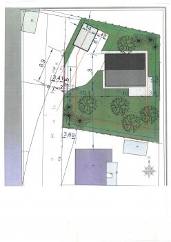 Lageplan eines Grundstücks mit Haus, Garten und Bäumen.