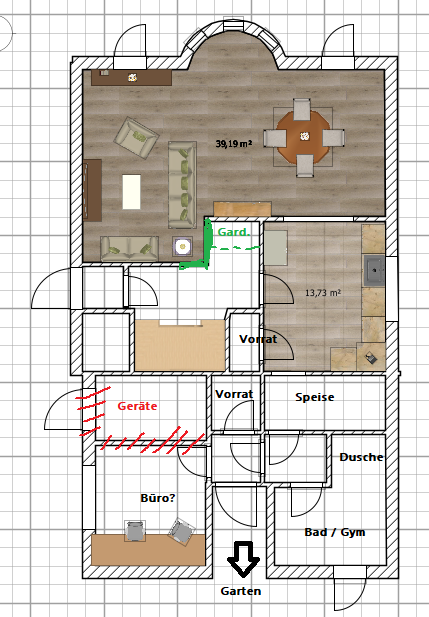 Grün eingezeichnet: Die Wand / das Eck würde ich etwas verlängern. Die Garderobe (momentan Einbau) würde ich drehen wie eingezeichnet, die Tür zum Wohnbereich käme weg.