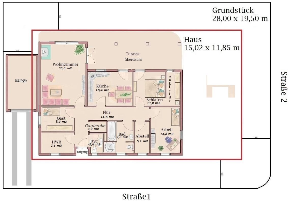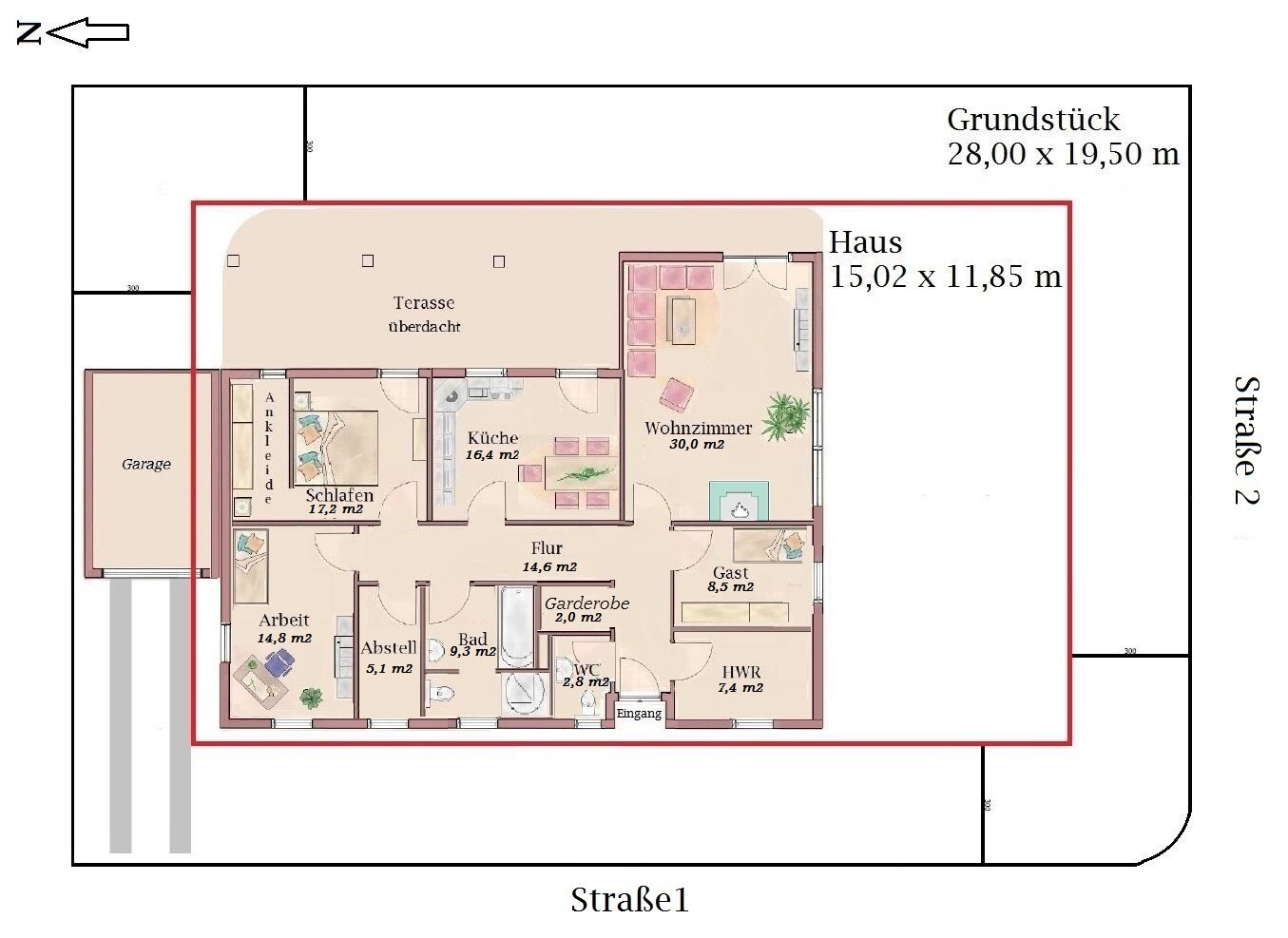 jetzt auch mal mit bemaßter Garage. Ich hoffe die 350 x 600 cm passen dafür.