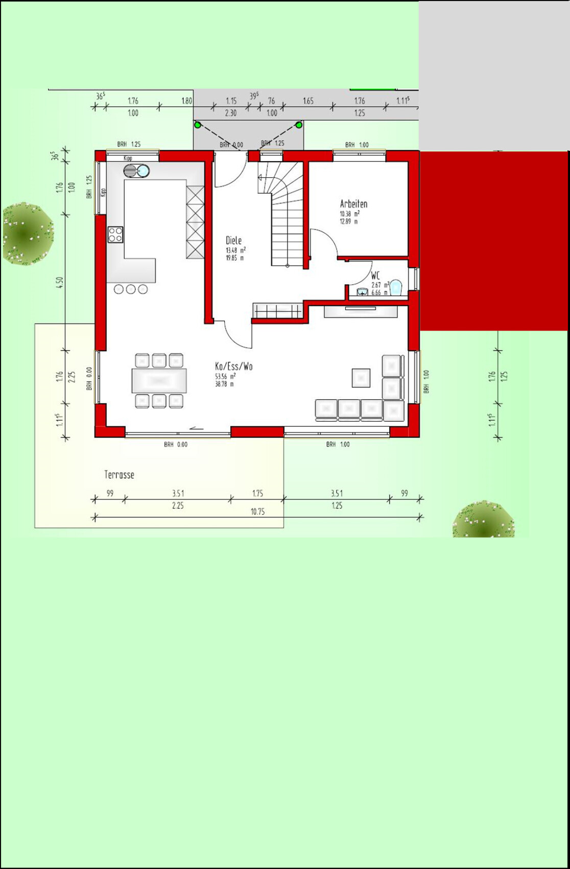 - Obwohl ich selbst nicht koche, bin ich ein großer Fan davon, wenn der Koch/die Köchin mit einem Schritt im Garten, an einem Kräuter-Hochbeet steht. Vielleicht könnt Ihr aus der "Fenster-Kipp-Ecke" doch noch eine Terrassentür extrahieren. Grundsätzlich gefällt es mir nicht, wenn Fenster nicht frei zugänglich sind, aber da gehen die Meinungen auseinander.