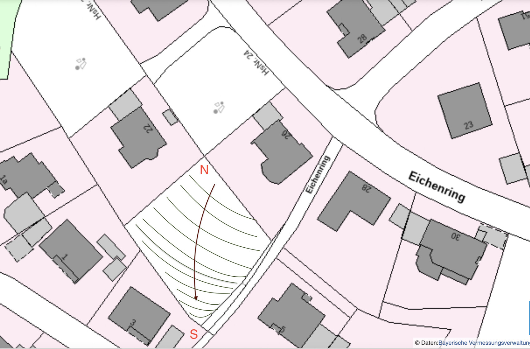 Ich hoffe, ich hab es richtig gelesen: der Hang fällt von Nord nach Süd 2,60m über Dein Grundstück nach unten? Ansonsten bitte korrigieren - in welcher Ecke ist Deine höchste Ecke?Ich habe es versucht graphisch mit Höhenlinien darzustellen. Der höchste Punkt ist im Norden. Der tiefste im Süden.