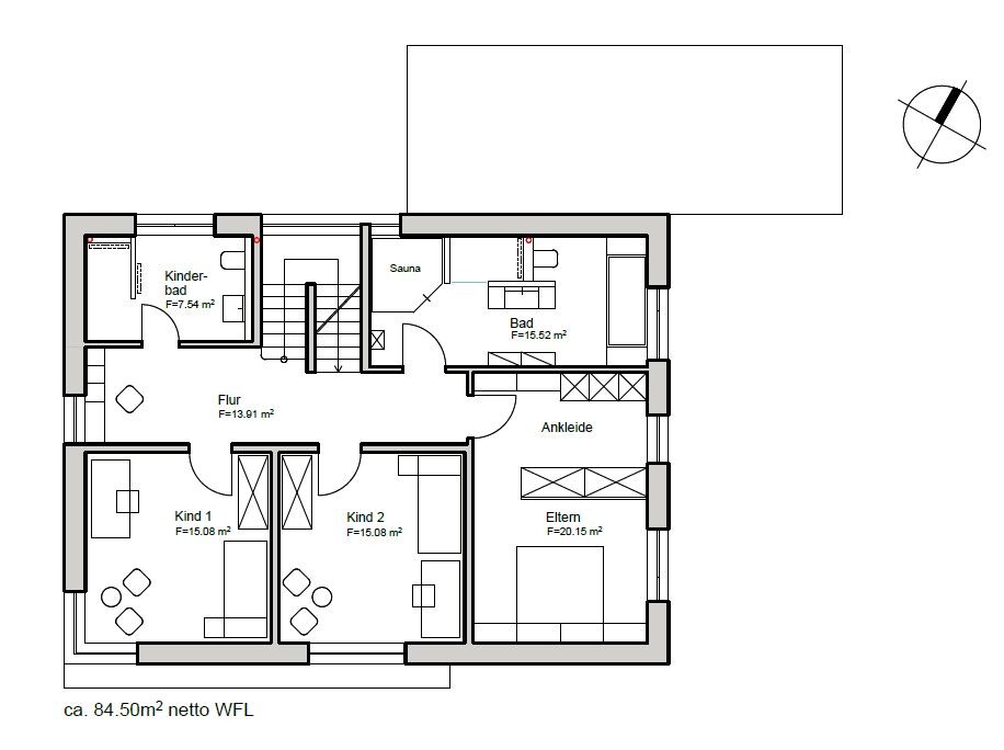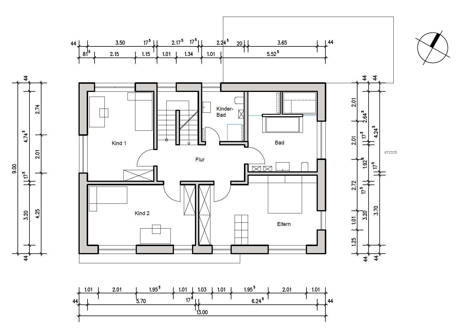 OG neu: Im OG haben wir uns von dem großen Flur getrennt um den Platz für die Kinderzimmer zu nutzen (alte Variante ist noch angehängt). Die Treppe ist jetzt wieder klassische Podesttreppe ohne Stufen im Podest, dadurch wurde die Treppe schmaler und planlinks passt nun ein Kinderzimmer hin (Lage der Treppe ist dann auch im DG von Vorteil bzgl. der Räume dort). Badezimmer erscheint mir so nur ziemlich gedrubbelt. Die Sauna müsste auch einen ticken größer sein (2x1,5m mind.) um sich nicht den Hintern an der Scheibe zu verbrennen 🙂