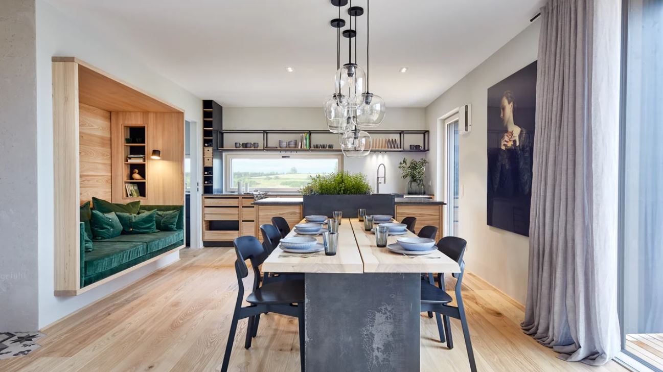 Deine Idee mit dem Esstisch an die Kücheninsel finde ich sehr gut. Wenn wir das aktuell machen, führt das nur dazu, dass man vom Flur aus direkt in den Tisch reinläuft bzw. vom Tisch aus nach oben in den Flur schaut. Wenn, müsste man vermutlich Küche mit Sofabereich tauschen (habe mal im Anhang einen meiner Meinung nach tollen Grundriss von Baufritz hinterlegt (Musterhaus Heimat), der diese Situation bis auf den Eingang aus der "falschen" Richtung abbildet. Davon ab: Baufritz hat echt tolle Grundrisse teilweise - schöne klare Linien, dabei sehr wohnlich, der Stil gefällt uns oft richtig gut).