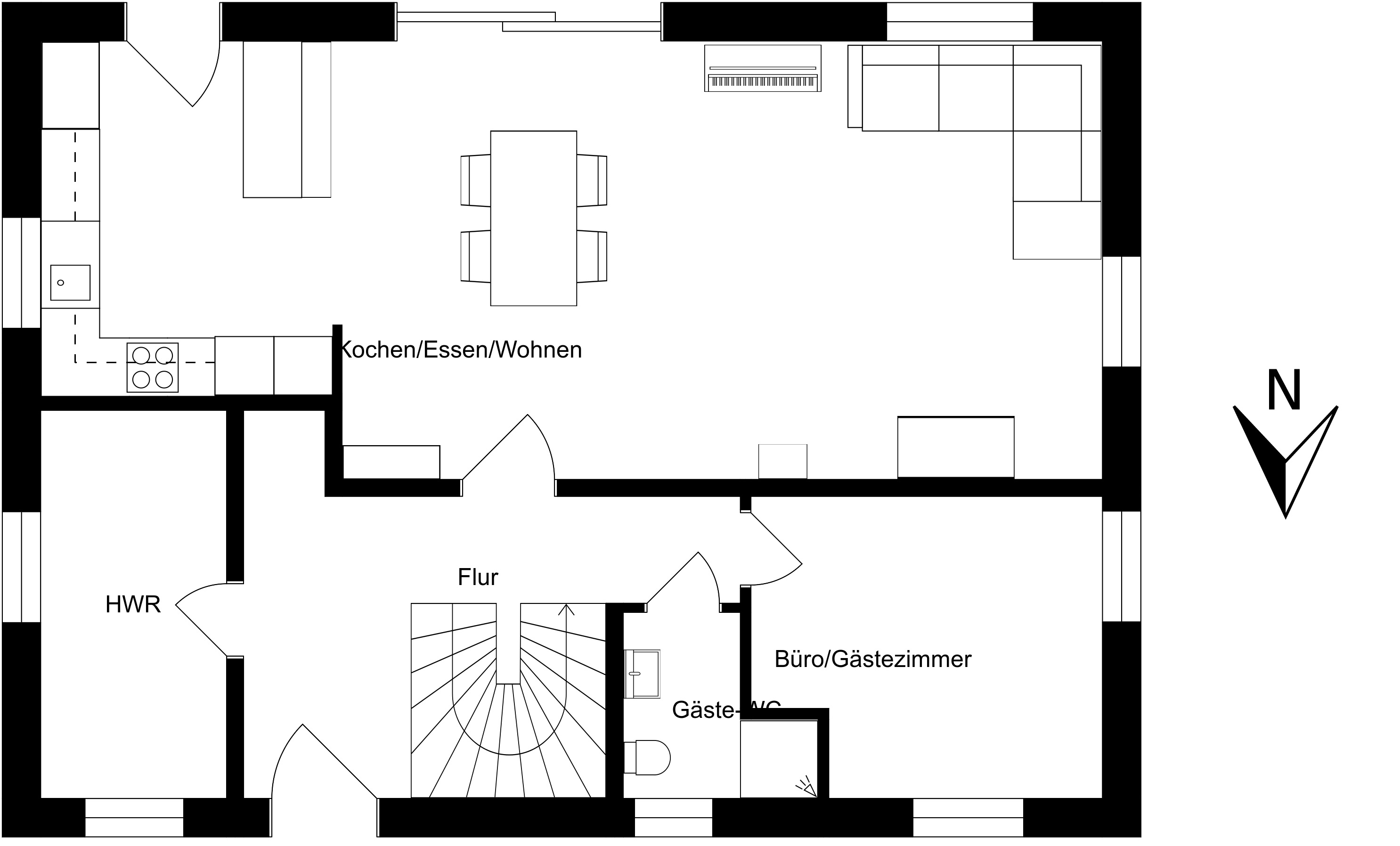 - kleine Nische für Garderobe im EG (im Flur gegenüber Eingangstür) ohne zusätzliche "Ecken"