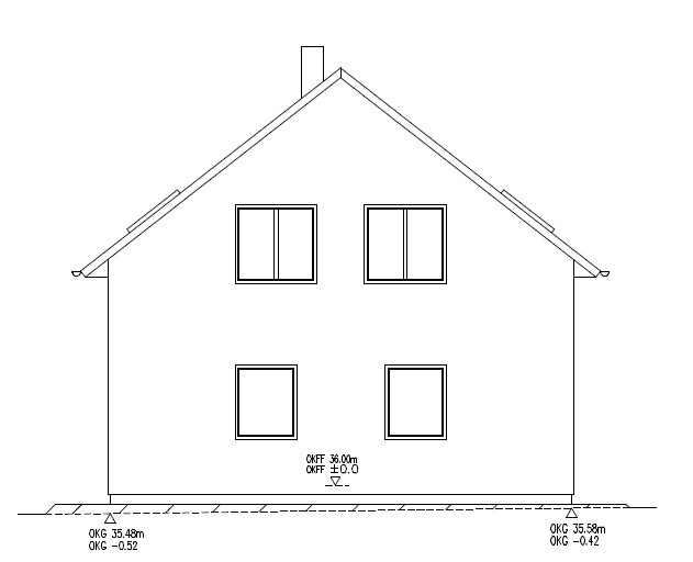 Schematische Frontansicht eines zweistöckigen Hauses mit Satteldach, Kamin und vier Fenstern.