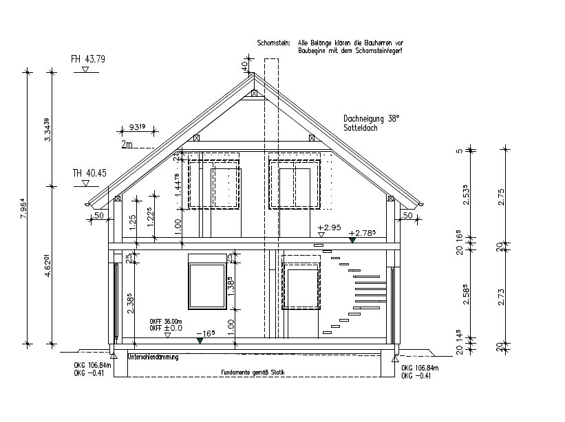 Schnitt durch ein zweigeschossiges Haus mit Treppe, Fenstern, Dach und Fundamenten.