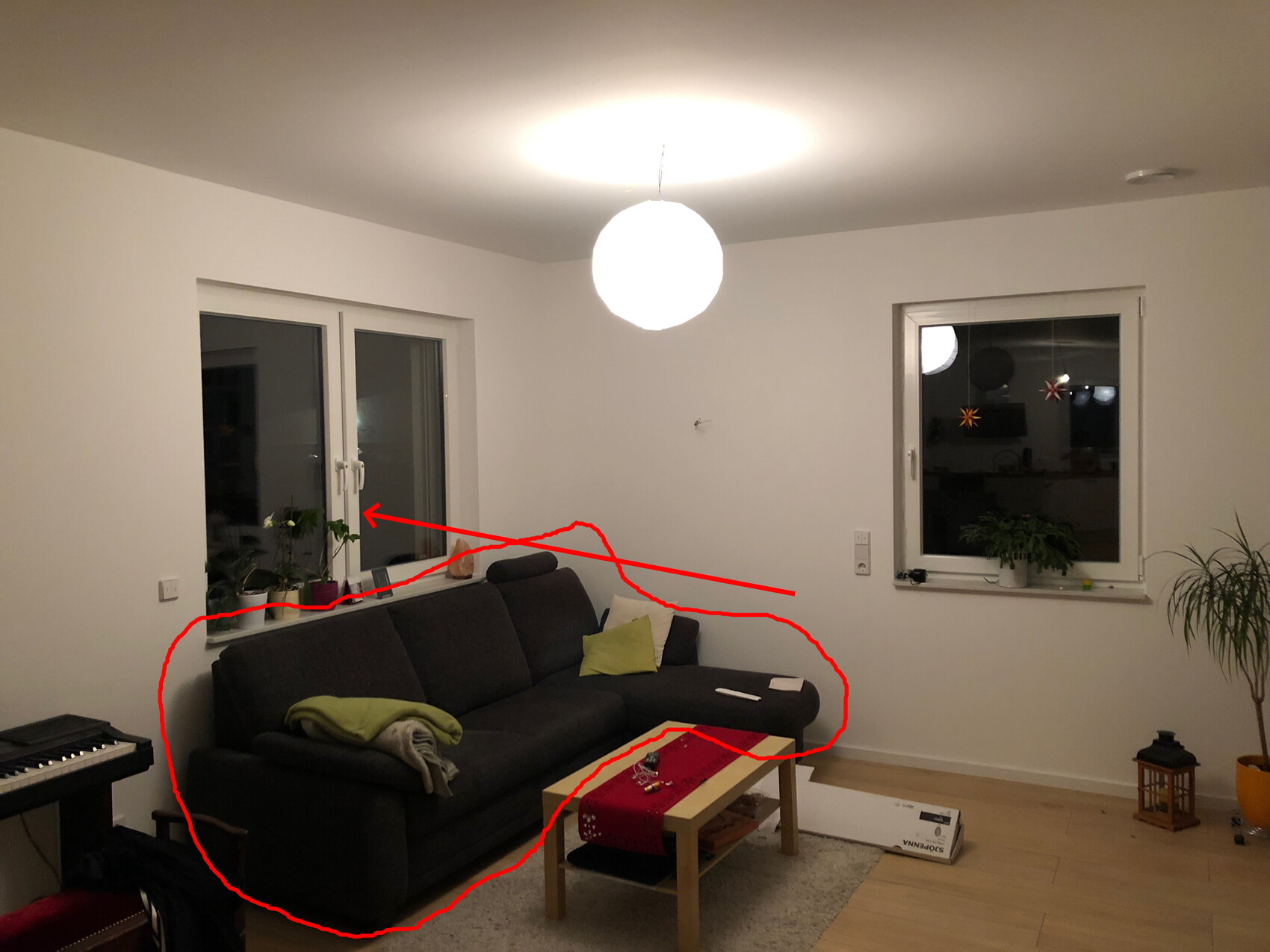 Wir wollen das aktuelle Sofa durch ein Ecksofa ersetzen, dessen Rückenlehne dann bis zum Westfenster reicht. Abschließend dann mit einem Hocker, der dann unter dem Westfenster wäre.Seh ich hier gar nicht. Ich seh einen 3-Sitzer oder so mit einem Fußteil oder großen Hocker. Und zwar an der Westwand mit Canapee rechtsseitigEcksofa wäre zu gepresst in der Ecke und gibt dem Raum gar nichts. Bist Du bei FB?Wenn ja, dann kann ich Dir dort ein paar Einrichtegruppen empfehlen.