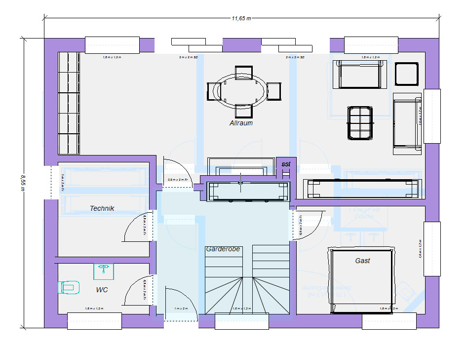 Ich glaube, die Treppe wirkt jedes mal so winzig, weil das Haus so lang und schmal ist. Ich nehm die Maße eigentlich immer vorher bei Treppe 1x1 und rechne mit recht großzügigen 300 Geschoss + 270 Raumhöhe. Diese hier ist 2,50m breit mal ca. 2m tief. Da zeigt mir das Online-Programm sogar bei 16 Stufen noch ein zu großes Schrittmaß an.Deine Schränke sehen auch eher nach 40er Tiefe aus, sind sicherlich 60er. Liegt an der Länge des Hauses.