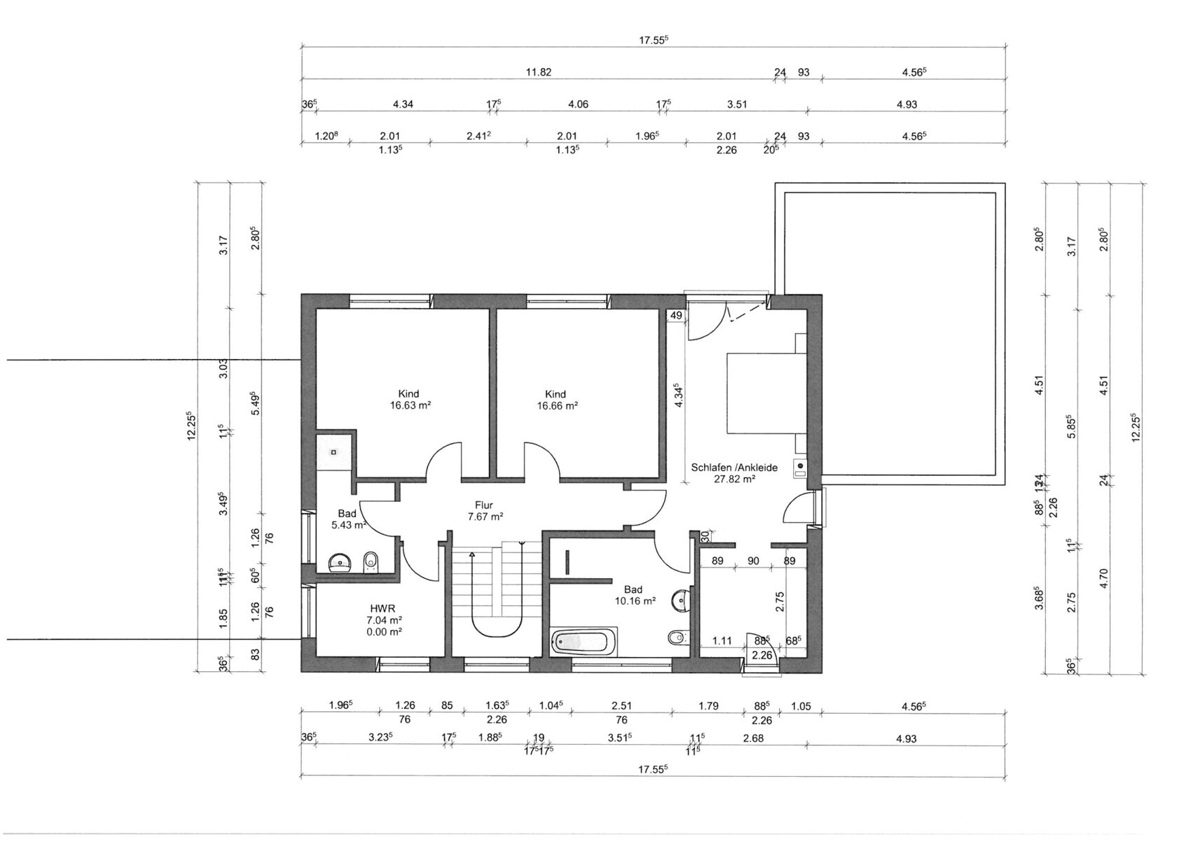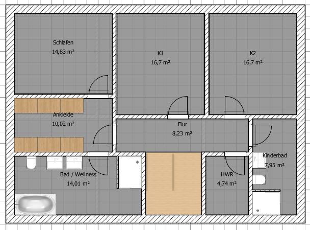 Ich hätte eine ähnliche Idee wie Romeo Zwo. Allerdings finde ich es unglücklich, wenn man für Ankleide oder Bad durchs Schlafzimmer muss. Die Ecke im Kinderzimmer finde ich auch nicht so dolle. Da ihr einen Keller habt, könntet ihr evtl auch mit einem kleineren Hauswirtschaftsraum auskommen oben und dafür den Kindern im Bad etwas mehr Platz spendieren. Wenn ihr kein Glas an der Dusche wollt, solltet ihr die aber in ein Eck legen, so dass das Wasser gegen eine Wand spritzen kann. Wenn du die einfach vorne offen lässt, gibts größere Pfützen. In meiner Lösung wäre auch der Flur etwas aufgeräumter und euer Bad würde ebenfalls schön funktionieren, inkl. Entwässerung. Fenster sind übrigens noch nicht angepasst.