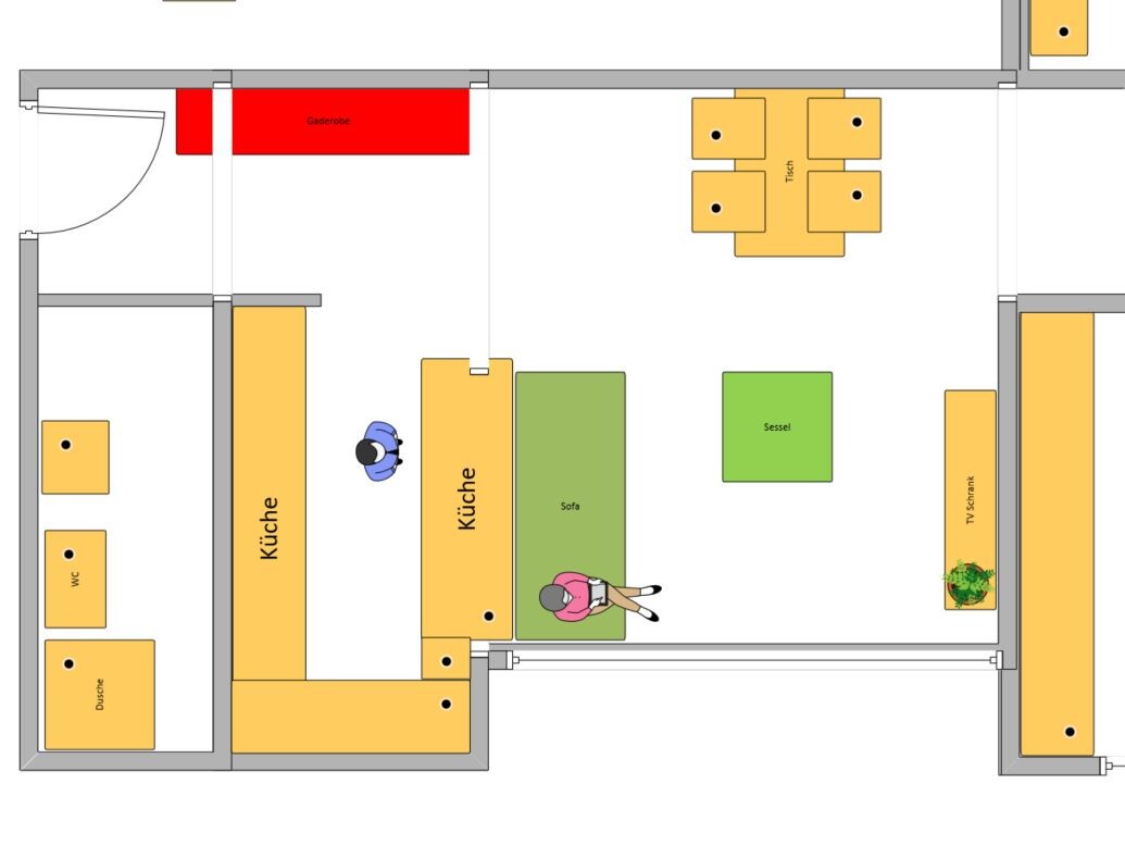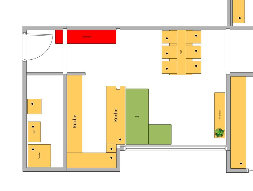 Und da kannst Du Deine rote Linie machen, aber nur bis zur Wand zwischen Küche und Bad.Das hatte ich verstanden. Da wir das sofa mehr oder weniger nur auf eine Art und Weise sinnvoll aufstellen können (wegen dem TV) müsste der Zugang zur Küche genau an der Stelle sein. Daher gefällt uns eine doppelzeilige Küche besser.