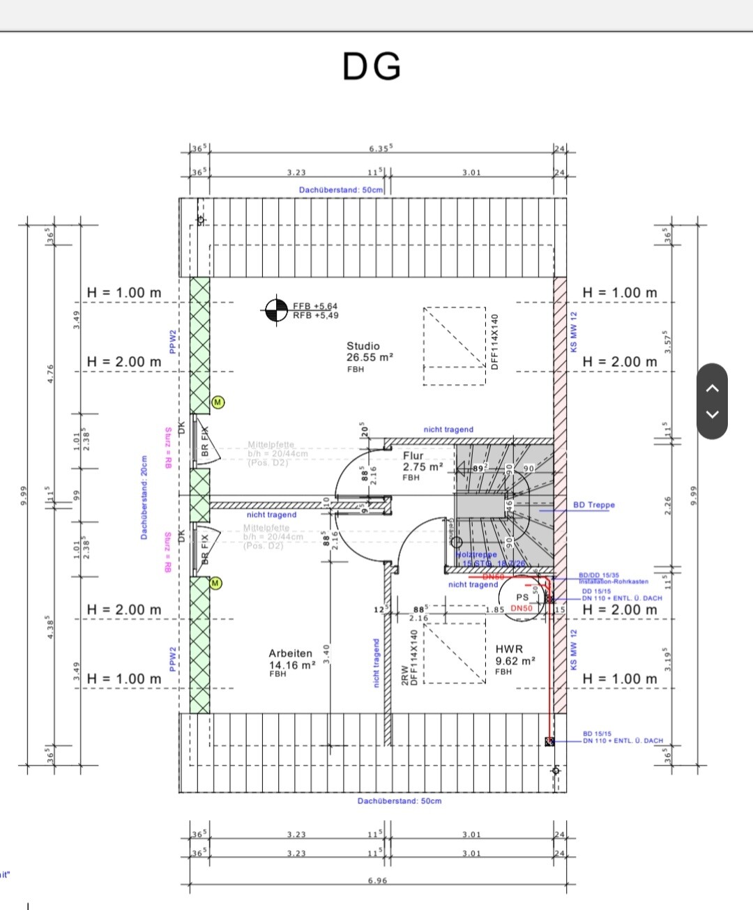 Deine 15cm Stufe kann ich gar nicht finden, wo ist diese? Die Dachterrasse wird ein Balkon...ich mach da kleine Gartenmöbel hin. Im Bebauungsplan konnte ich zur Gesamthöhe nichts finden, klar wird durch den Kniestock das Haus noch höher, aber im schlimmstenfalle könnte ich bei 30 cm und 35°Satteldaxh bleiben. Das Haus sollte aber meiner Meinung nach über dem Straßenniveau 1 m sein und nicht nur so k app eine Stufe, wie eingezeichnet.