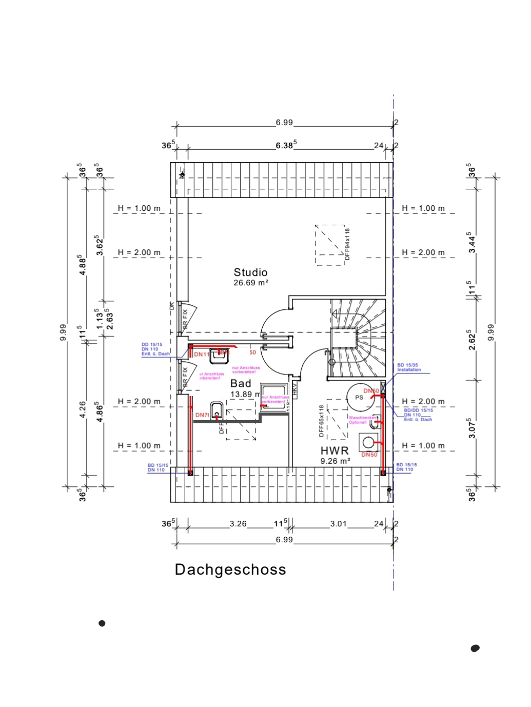 - das Bad im DG bekommt ein Fenster in den Giebel, Anordnung eher so: