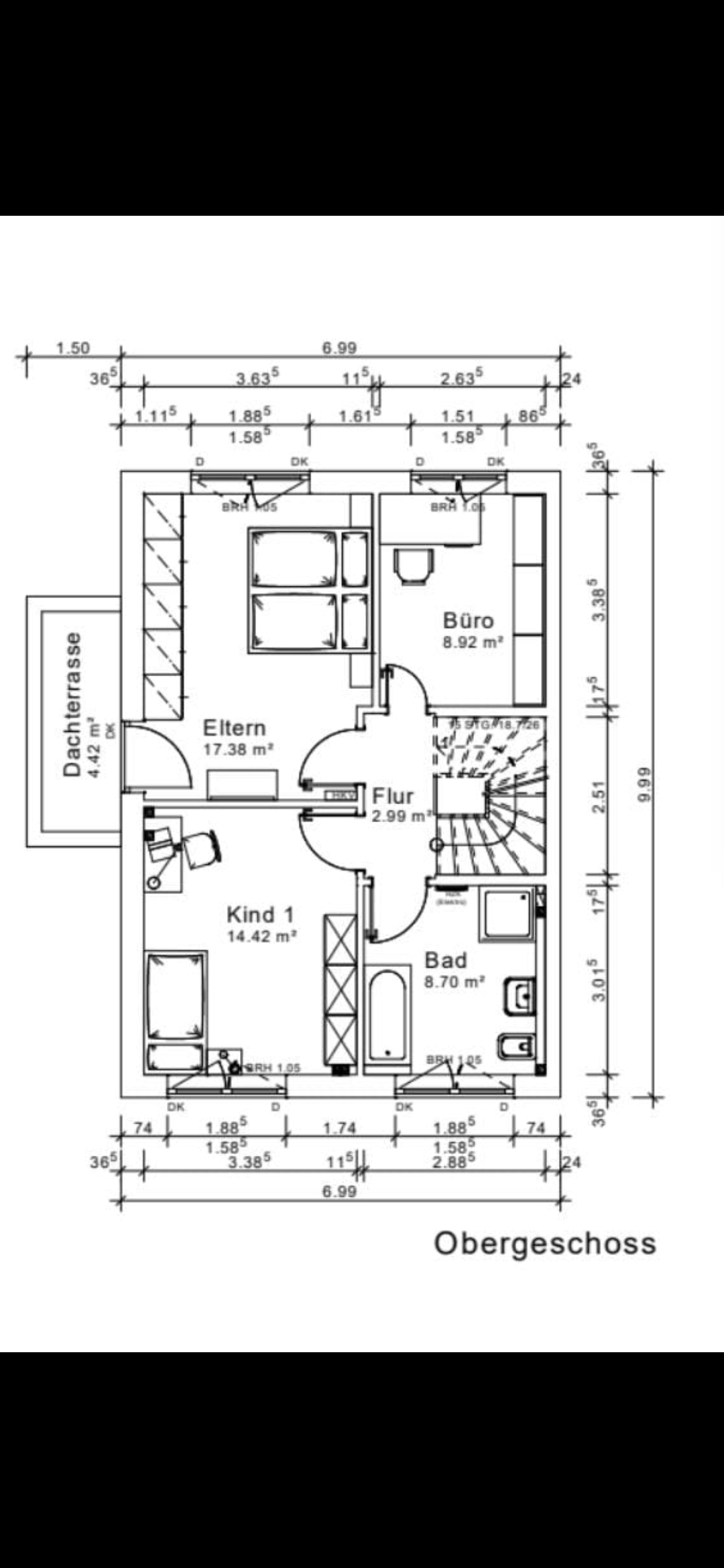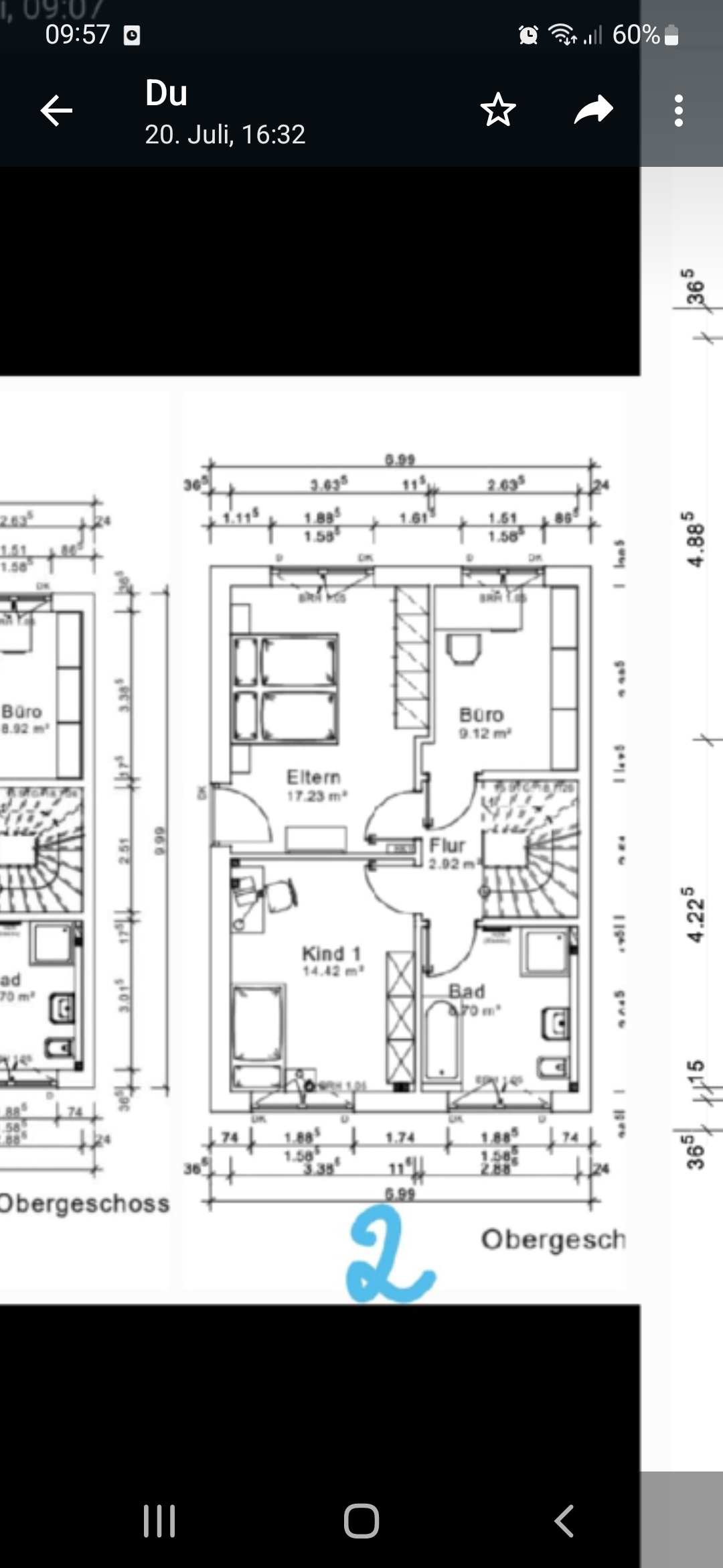 Wäre es nicht vielleicht auch eine sinnvolle Idee, den Studiobereich im DG als Elternschlafzimmer zu planen und die 3 Räume im OG halbwegs gleichgroß zu gestalten und quasi mal als Kinderetage vorzusehen?Ja das schon, aber finde es trotzdem komisch. Sie hatte es ja eingezeichnet. Die schmalste Tür, die man dafür haben darf, wäre 60cm Breit oder 63... weiß es nicht mehr, das wäre bei mit in der Wohnung die WC Tür. Im.WC ist es mir ehrlichgesagt noch nie aufgefallen, dass die Tür so schmal ist, aber irgendwie will ich das für ein Büro trotzdem nicht haben. Aber mit der schmalen Tür ist alles so,. Wie ich es gerne hätte, nur die Tür ist dann schmal. Alternative Moment gibt es doch noch eine...Moment ich schicke sie euch