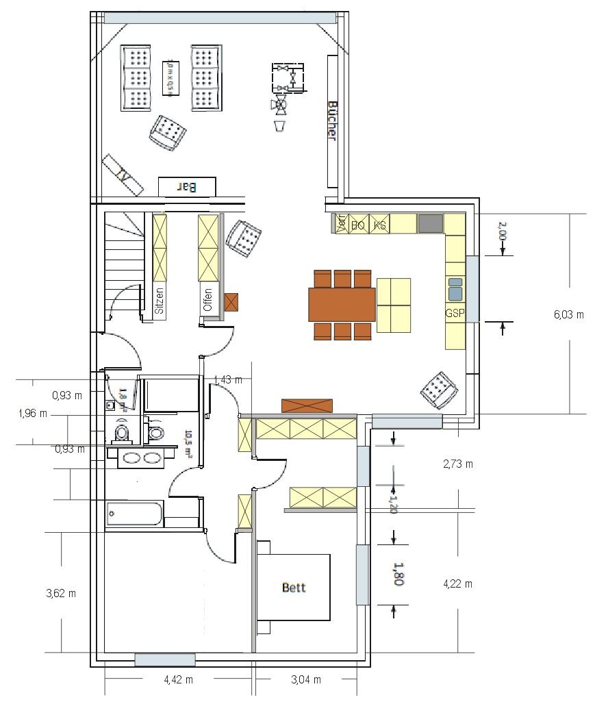Küche dann als L, dazu einen kleinen Arbeitsblock zum Backen, Buffetanrichten usw. Richtung Tisch mit offenen Regalen, z. B. Toaster, Lektüre, Ladestationen für Handys, Telefon etc.