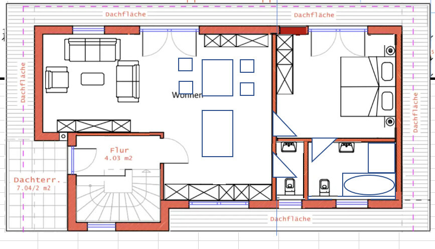 Der Grundriss gefällt uns wirklich gut. Danke ! Meinst du, dass das Bad in dieser Anordnung wegen der geringen Deckenhöhe erdrückend wirken könnte?Ein Kniestock von 1 m ist es noch nicht. 😉 Ich habe doch das WC und die Badewanne unter die tiefe Seite gesetzt. Man könnte ja noch mit einem Dachflächenfenster etwas gewinnen.Das Bad könnte ja auch mit einer Duschbadewanne auskommen, dann hast noch Platz für eine Waschmaschine u. Trockner.