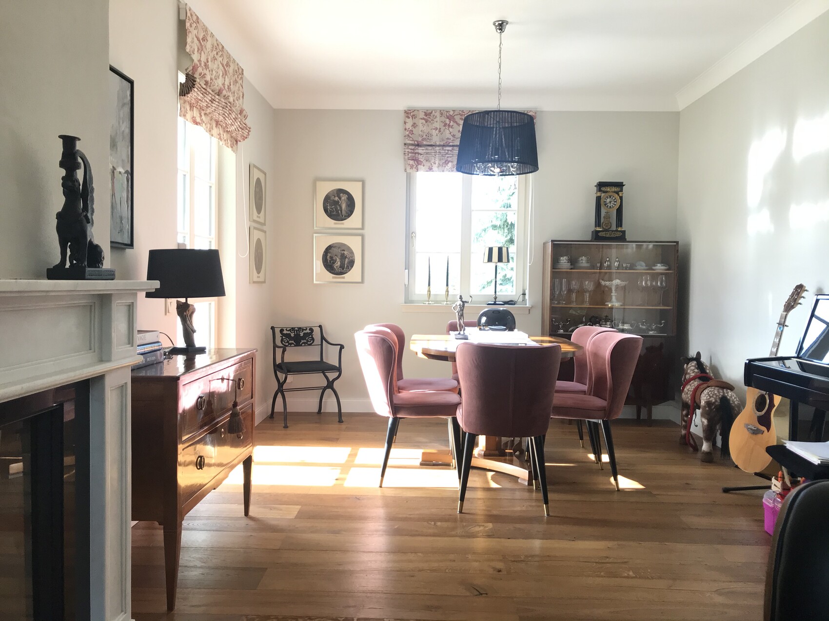 Esszimmer mit rundem Holztisch und pinken Stühlen, Glasvitrine, Klavier rechts.