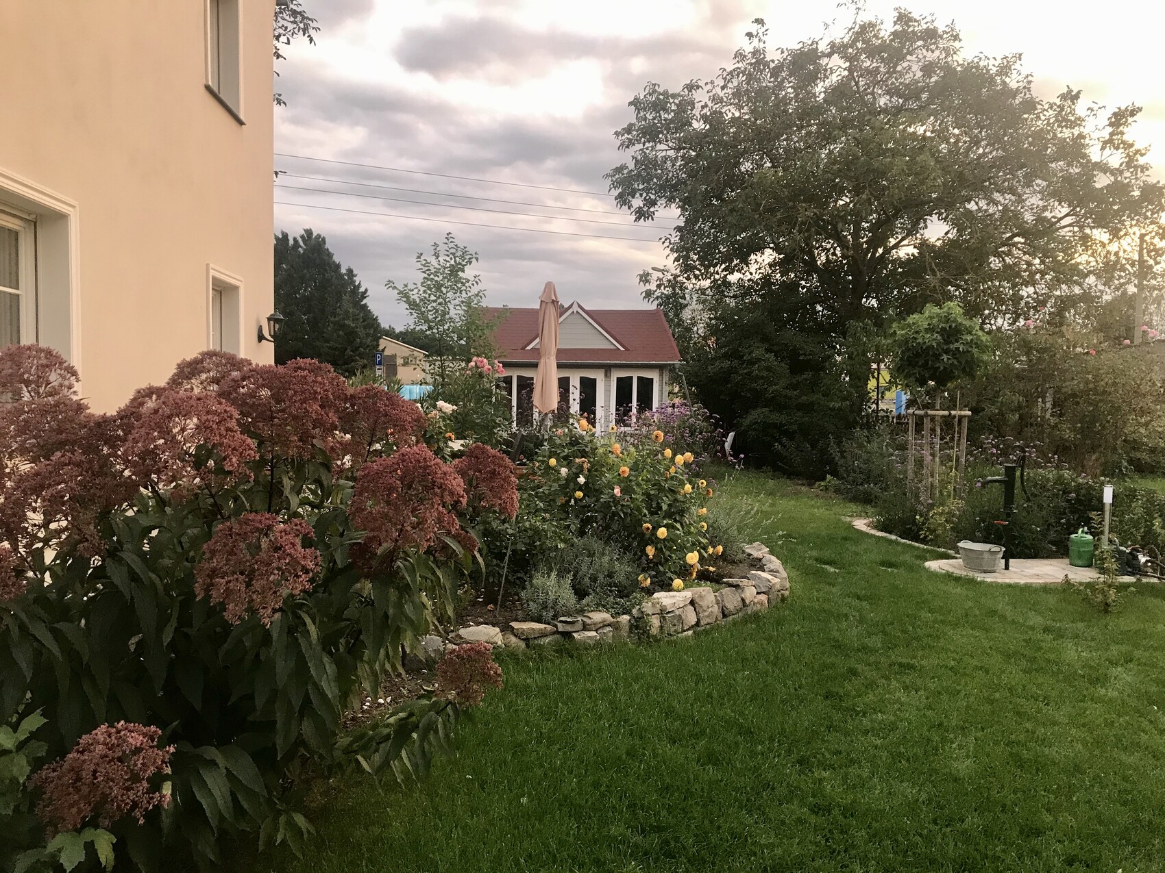 Gartenansicht mit Beeten am Haus, rosa Hortensien, gelbe Rosen, grünem Rasen und Pavillon