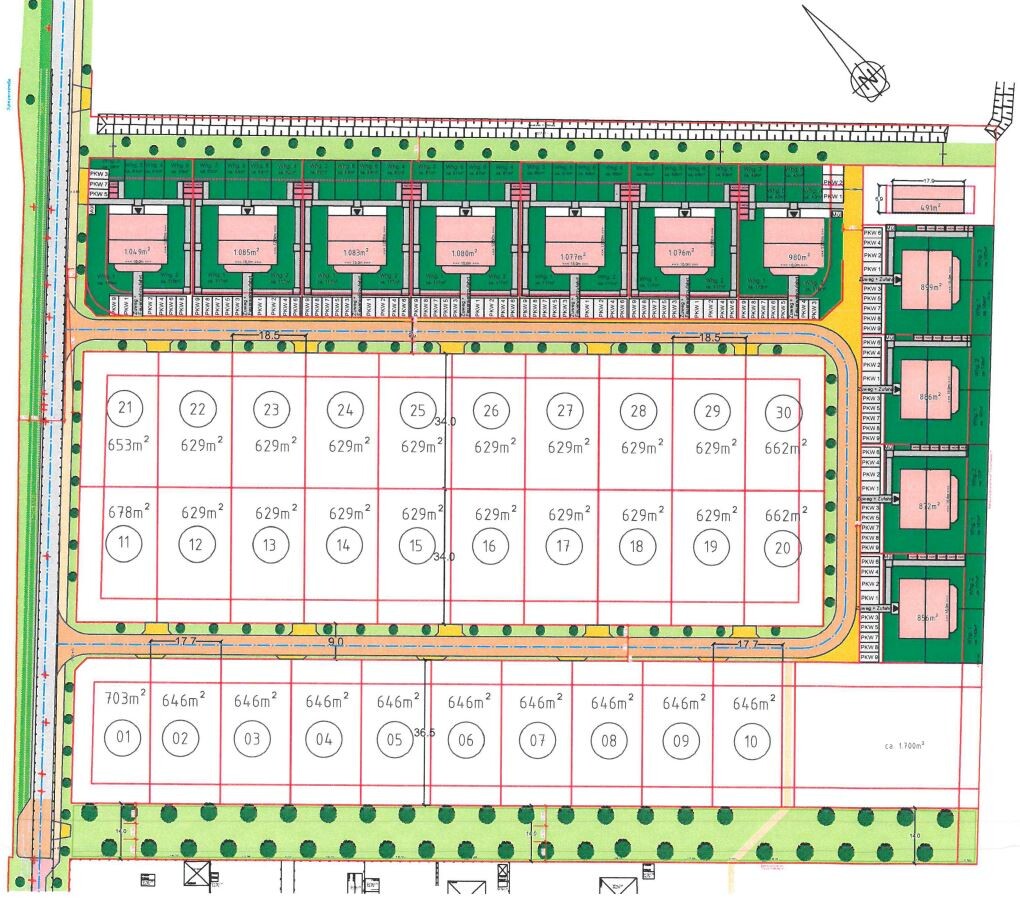 Lageplan eines Siedlungsgebiets mit nummerierten Parzellen 01–30, Straßen und Grünflächen.