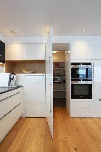 Die Speisekammer ist 1 Meter tief, sodass bei beidseitig 30er Regalen ein 40er Gang wäre. Ok das ist schmal, aber der Gedanke war, möglichst viel Stauraum und möglichst wenig Platz verschwenden.Gefrierschrank braucht da eigentlich nicht rein. Ist bisher zumindest noch nicht angedacht. Sollten an der Zugangswand zur Speisekammer Küchenmöbel stehen und der Zugang durch einen Schrank erfolgen, hat man ja das Problem mit dem Platz für die Tür nach innen nicht mehr. (Beispielbild im Anhang)