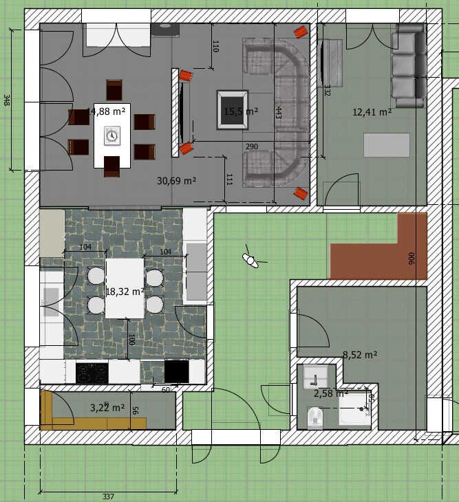 Küche in den Süden, das TV-Zimmer kann auch Richtung Norden abdriften...