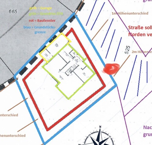 Fotografiert habe ich im Prinzip von der untere rechten Ecke des Grundstücks mit Blick nach oben links (rot markierter Punkt). Ergo liegt die Garageneinfahrt ein gutes Stück weiter oben.