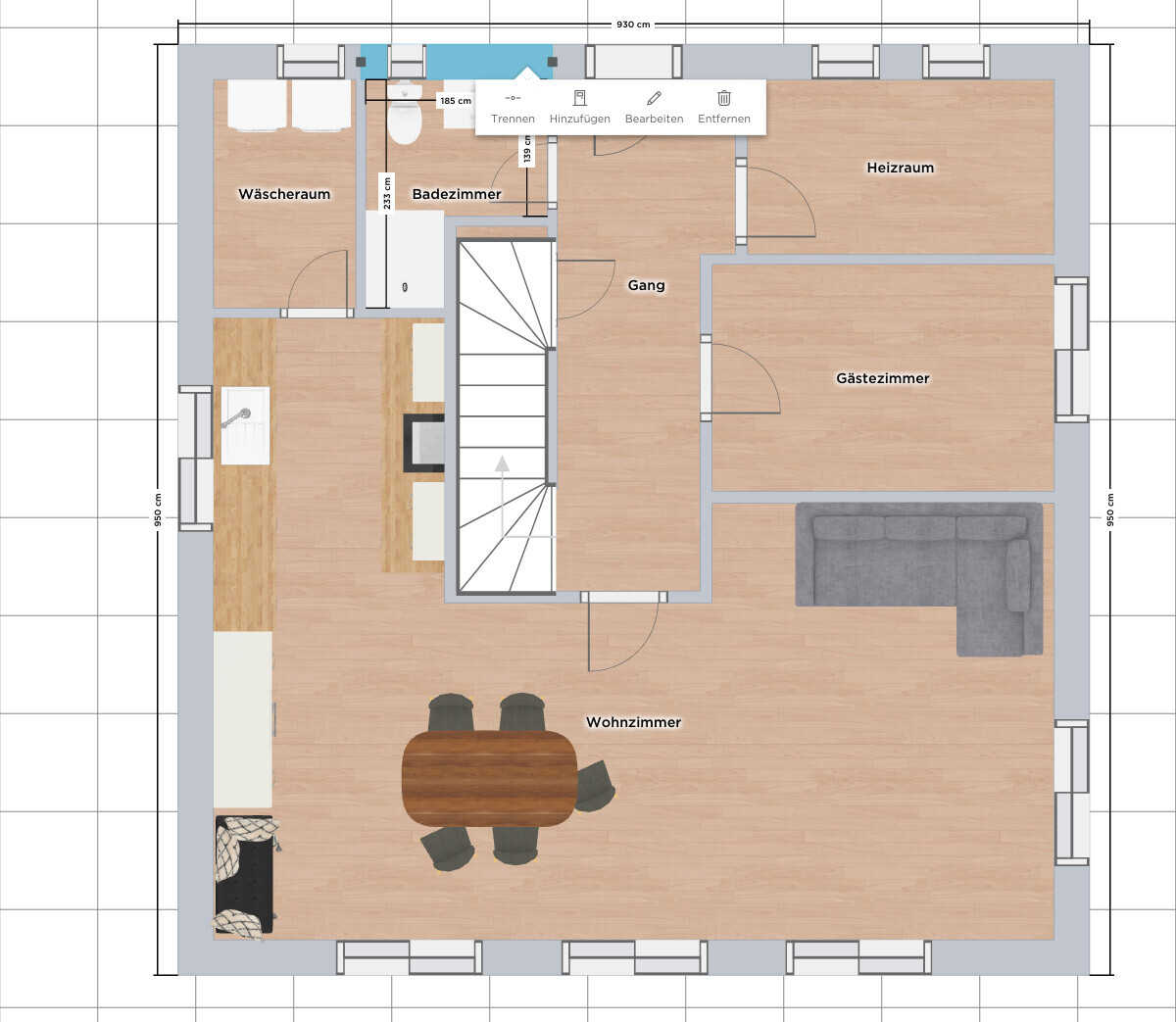 Also ich brauch ehrlichgesagt auch kein Fenster in der ankleide,Das Problem ist einfach, dass man ständig ein Licht anknipsen muss..Nun denn: ich hab da mal mit den Maßen 9,5 X 9,3 rumgespielt. Außenwände sind 36, Innenwände hab ich pauschal 12 genommen.
