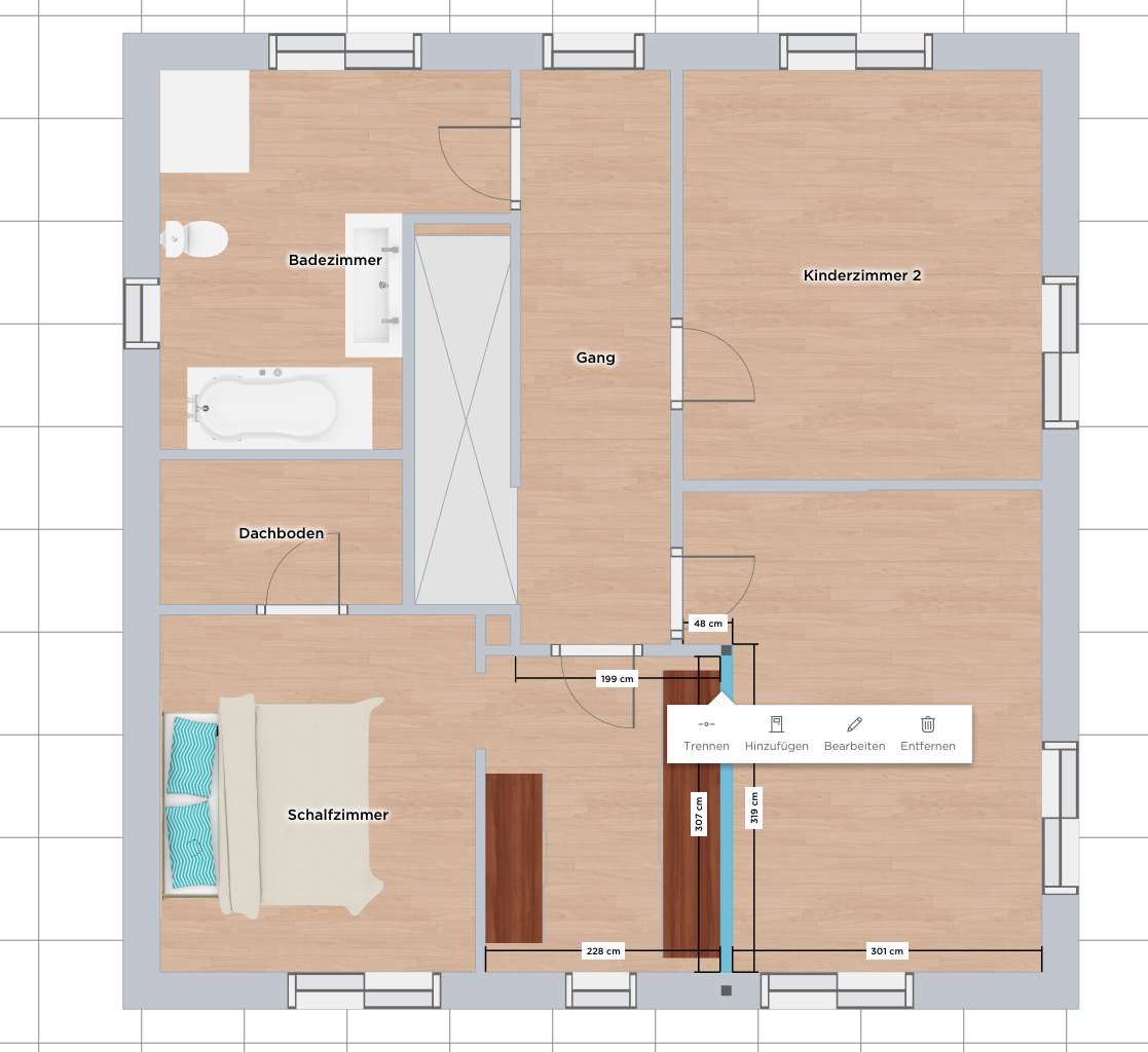 Das Programm kennt keine Powervermaßung. Bett ist 2 x 2 Meter (etwas größer wegen der Decke), Wanne 1,80 x 0,8...