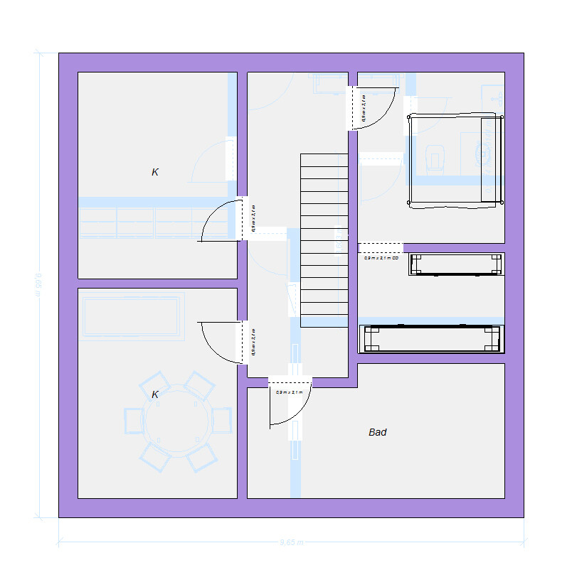 An der Position der Treppe hab ich erst mal nichts geändert, da mir persönlich das EG ganz gut gefällt. Mir fällt auf, dass die Badewanne im Plan sehr groß wirkt. Wollt ihr das so? Ist die riesige Wellnessdusche euer Wunsch (Find ich cool, aber bei der doch recht kompakten Hausgröße wirklich nötig)? Sonst ließe sich das Bad vielleicht auch so aufteilen, dass der Bereich hinter der Treppe als Abstellkammer oder als Waschraum genutzt werden kann. Die zweite Tür im Bad wäre nicht schön, aber die Wäsche auf einer Ebene zu haben ist ein Vorteil.