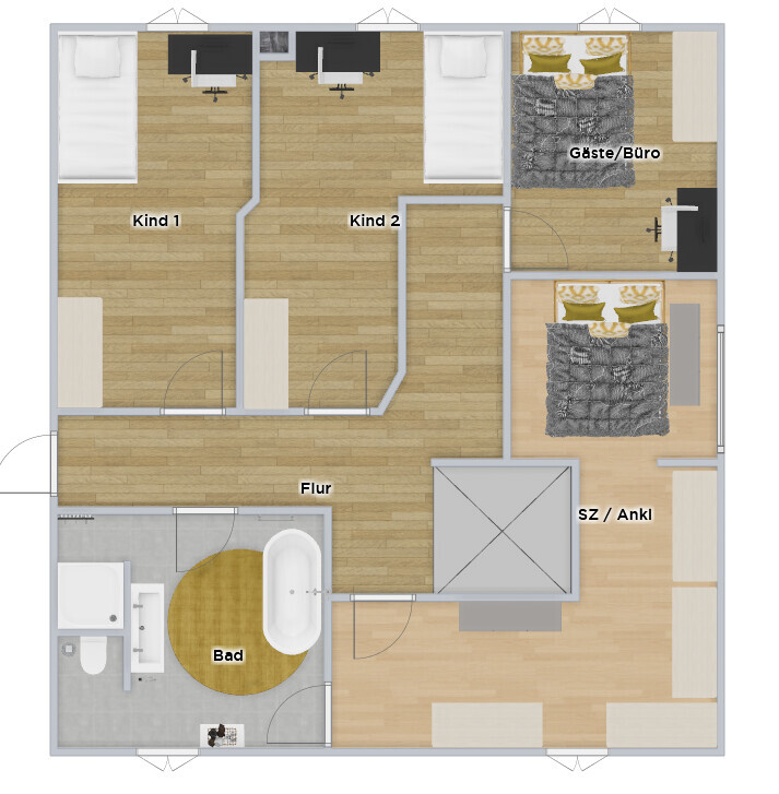 Ähnlich auch in den Kinderzimmer.Ich hänge mal ein Bild an, wie ich das Ganze mit Möbeln geplant habe. Ich finde das lässt sich doch so umsetzen? Im Schlafzimmer brauchen wir tatsächlich dann nur noch ein Bett 2x2 Meter, da das Ankleidezimmer Anstellfläche für Schränke bietet.
