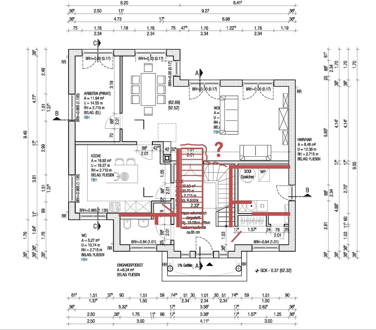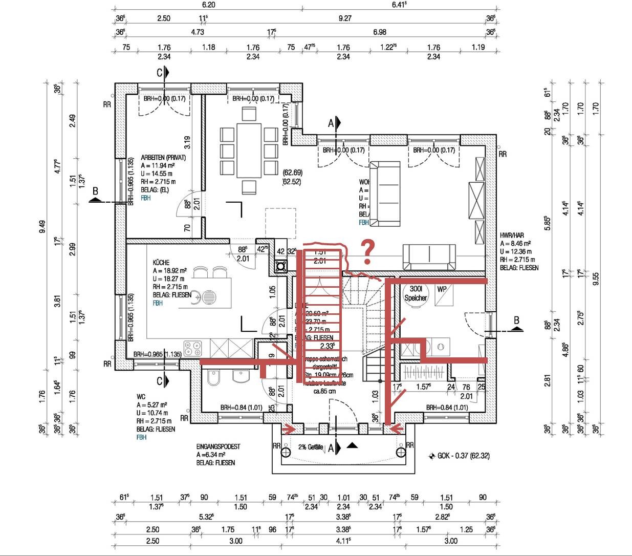 Klären muss man allerdings, wie die Treppe im OG sitzt. Da könnte es eng werden. Idealerweise wären es bei der wohl geplanten Geschosshöhe 17 Steigungen mit dann 17,98 cm und einem Auftrittsmaß von ca. 27cm. Das ergäbe rund 460 cm Treppenlänge. Wobei bei der Geschosshöhe der OG-Flur 1 bis 1,5 Stufen aus dem EG überdecken darf.