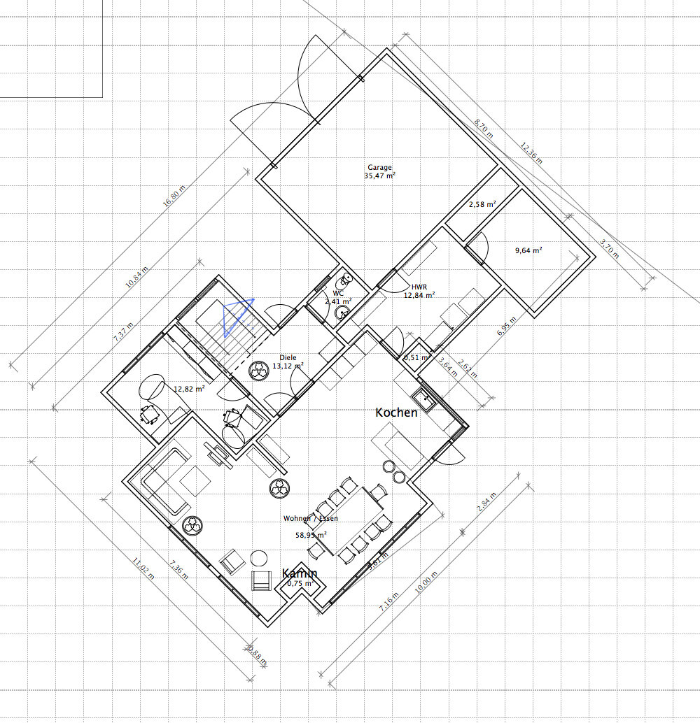 Die Zeichnung, die wir hier erstellt haben, gibt einfach nur die Kombination aller unserer klar definierten Ziele aus. Manche Ecken sind so perfekt nach unseren Wünschen gestaltet, andere wurden eben "passend gemacht / angepasst", so wie die Büro / Wohnzimmer Ecke, welche nicht optimal ist. Und genau bei diesen Problemen hoffen wir auf die Hilfe des Architekten.