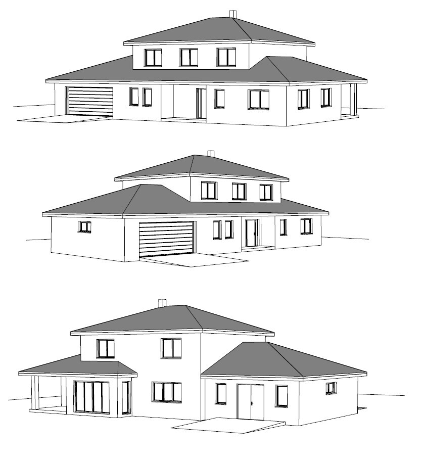 Drei Ansichten eines modernen Einfamilienhauses mit Garage, vielen Fenstern und einem Eingang.