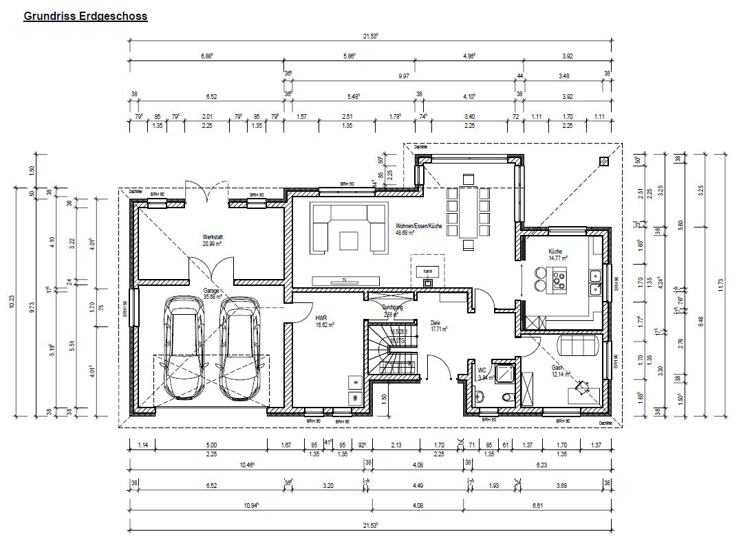 Grundriss Erdgeschoss: Garage, Werkstatt, Wohnen/Essen/Küche, Diele, Gast, WC, HWR