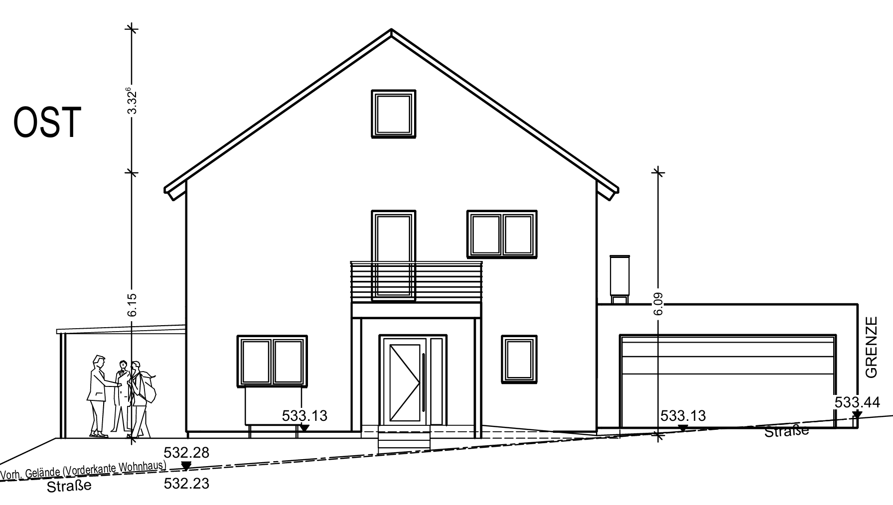 Die Garage steht ca. 30cm im Gelände. Da haben wir Bitumenanstrich und bringen noch ne Noppenbahn an. Das Haus haben wir 30cm über Straßenniveau. Das hat uns das Bauamt damals so genehmigt.