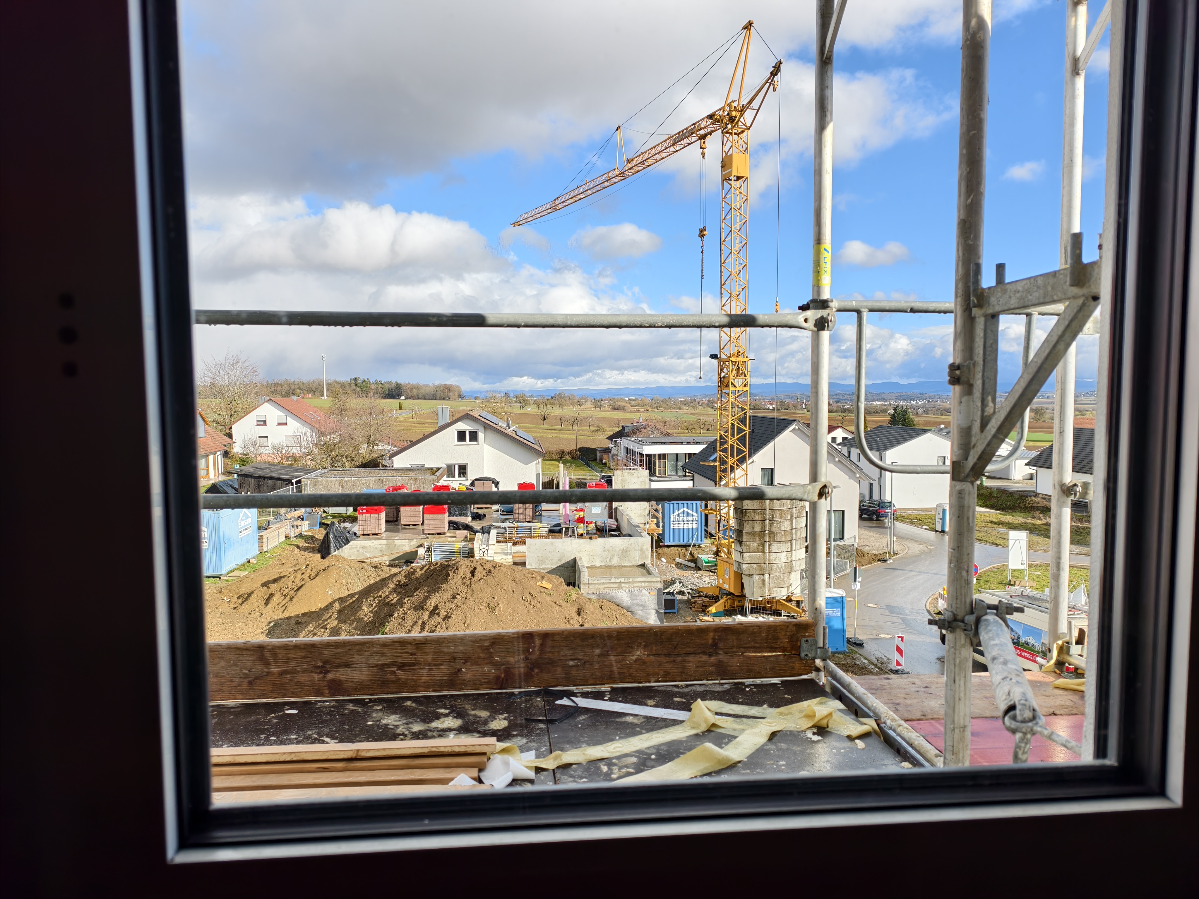 Damit rutscht unser Haus auch ca. 1,2m über Straßenniveau. Wir haben einen leichten Südhang und einen ganz leichten Hang nach Osten. Da dann erstmal Straße kommt sitzen wir recht weit oben im Baugebiet. Hier exemplarisch ein Bild aus dem Fenster Dachboden-Osten.