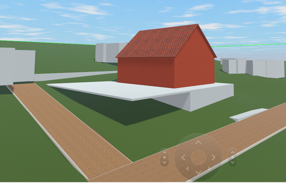 3D-Modell eines roten Hauses auf erhöhtem Fundament in grüner Umgebung