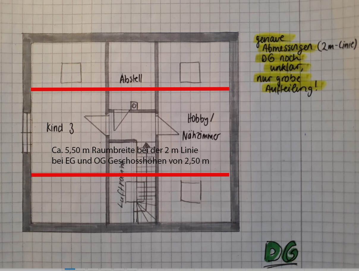 Der Dachbodenausbau wird mit weniger Platz auskommen müssen, als in Eurer Skizze.Vielen dank Myrna_Loy für die Berechnung und Visualisierung! Das hatte ich leider schon befürchtet. Wir werden das in unseren Überlegungen berücksichtigen und eventuell dann im DG nur einen großen Raum planen