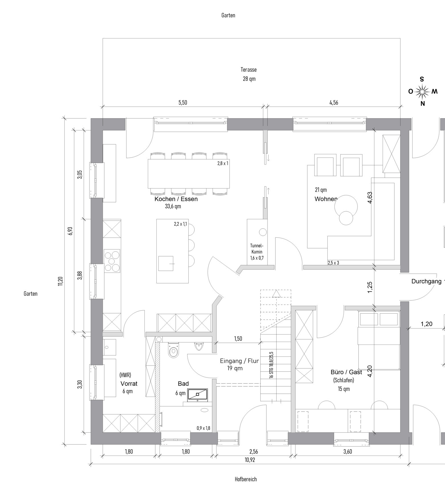 Als erste Spielereien sind solche Skizzen prima - am Gebäude kann man dann abklopfen, ob das überhaupt so funktioniert - und mit wieviel Aufwand das Funktionieren verbunden ist - uns haben die Kanalanschlüsse im Boden z.B. aufgrund ihrer Lage auf dem Grundstück richtig Probleme bereitet. Die Heizung war auch knifflig und hat einen Teil der Planung über den Haufen geworfen.