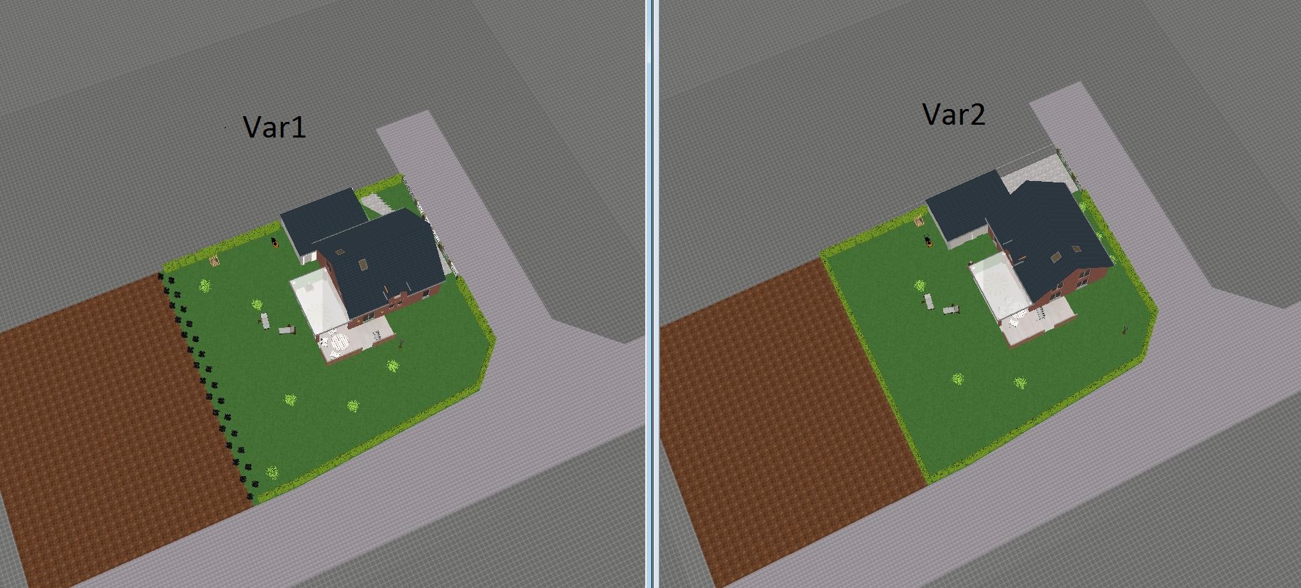 Wir schwanken jetzt zwischen 2 Varianten wie wir das Haus auf dem Grundstück stellen könnten (Anmerkung: Straße im Süden nur ein Rad/Fußweg)