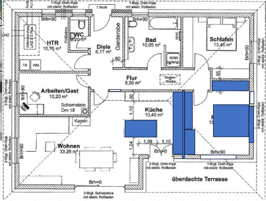 DasThema Grillen ist ja bedeutend, was ich von mir auch kenne. Insofern würde ich diesen Bereich der Terrasse gleich wichtig und angemessen mitplanen und auch "Entlastung" der Küche betrachten. Hier stellt sich natürlicb die Frage, ob dahn dort das Kinderzimmer an der passenden Stelle ist und ihr nicht lieber tauscht mit Eurem Schlafzimmer. Das Kinderzimmer liegt auch noch an der Küchenwand, auch das wäre anders wohl besser.