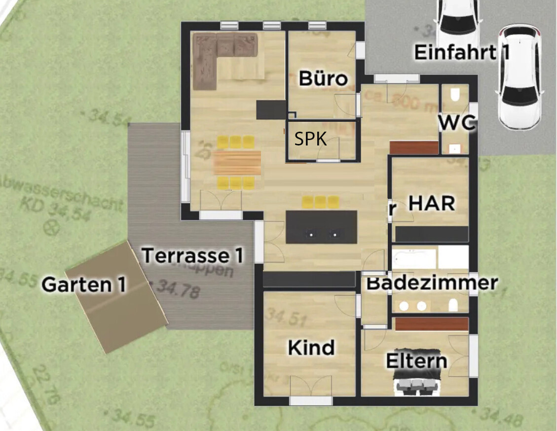 Ich habe mich nochmal etwas ausprobiert und es ist.. tada.. etwas herausgekommen, was schon mehr oder weniger geplant wurde. Es gibt zwar Modifikationen, aber vom Grunde her ist es gleich, Aber auch irgendwie anders. Alles, was ich probieren wollte, ist immer größer geworden. Auch dieser hier ist jetzt so 125qm groß. Allerdings finde ich den Allraum in Kombi mit dem Eingang schlüssiger.