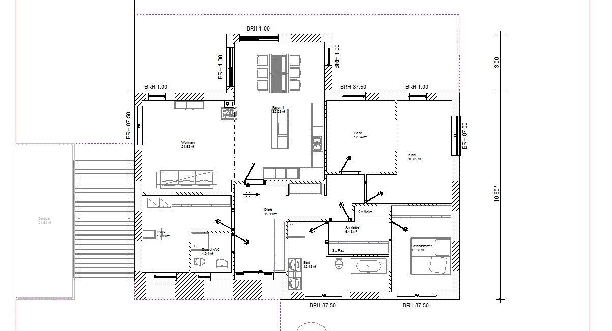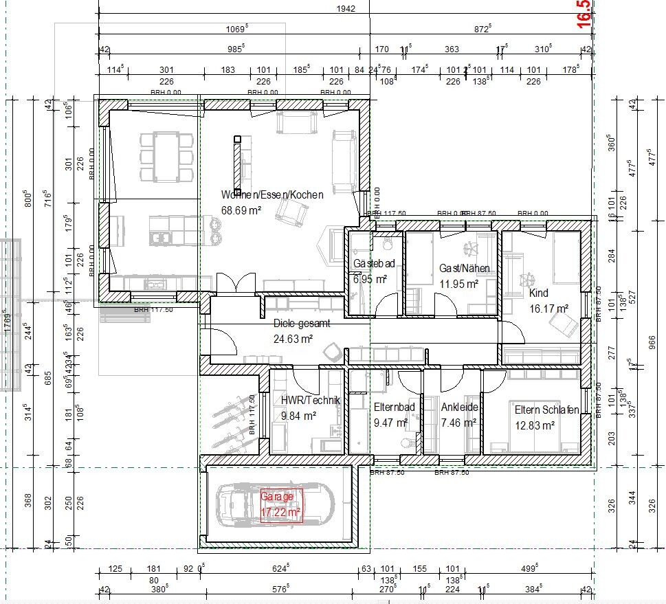 Hauswirtschaftsraum hat Platz für Technik, aber auch eine Wand für Ablageschrank und Regale. Gleiches gilt für die Garderobe (2,5 Meter Breite), 3 x Pax passt in die Ankleide, wie auch ins Gästezimmer und Schlafzimmer. Sogar im WZ würde ein Schrankklotz passen. Gast/Näh ü12qm, Kind ü16qm. Schrankwände alle plus 10/20cm RBM in der Zeichnung.