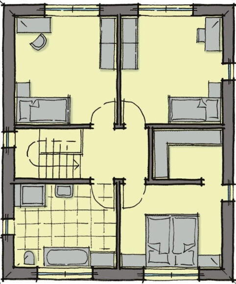 Eine Treppe mit verzogenen Stufen empfinden wir als äußerst unangenehm und haben daher bewusst eine Treppe mit geraden Stufen gewählt. Unsere Eltern habe beide Probleme mit dem Treppensteigen. Vom Platzverbrauch sehen wir bei der L-Treppe einige Vorteile gegenüber z.B. gerader Treppe (sehr lang, viel Platz für Flur erforderlich) oder U-Podesttreppe (1 m² weniger). Außerdem ist durch die Form der Eingangsbereich nicht so beengt, wie in manchen Häusern, bei denen die gewendelte Treppe direkt neben der Tür abgeht.Das sich über die Ästhetik solcher Treppen streiten lässt kann ich nachvollziehen, wir hätten auch lieber eine gerade Treppe gehabt, aber bei 300m² Grundstücksgröße optimierst du alles am und im Haus, wirklich alles. Wenn man mal Probleme bekommt mit dem Treppensteigen spielt es meiner Logik nach keine Rolle welche Form die Treppe hat. Um nochmal auf meine ursprüngliche Aussage zurückzukommen wie der Grundriss effizient aussehen könnte, anbei mal ein Beispiel. Das sind meinem empfinden nach angenehm dimensioniert und geschnittene Räume. Bei uns sieht der Grundriss übrigens fast genauso so aus, nur das wir statt Ankleide ein Büro mit 9m² dort platziert haben und die Treppe etwas breiter dafür aber kürzer ist.Dass das nicht jedermanns "Traum von Wohnen" ist, ist klar, aber wir hatten wie gesagt Abstriche beim Lifestyle machen müssen um überhaupt ein 11,5 x 9m Baukörper auf das Grundstück zu bekommen. Ich behaupte aber auch, dass u.a. wegen des einfachen Layouts die Baukosten bei uns im Vergleich zu Bauvorhaben von Freunden (die eher nach ihren Wünschen gebaut haben) absolut im Rahmen geblieben sind und wir dafür mehr Geld in die Qualität statt Quantität investieren konnten.
