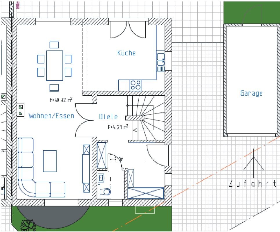 - Küche und Wohnzimmer waren ursprünglich getauscht. Wir wollten bewusst die Küche im Süden haben, damit der Weg zur Terrasse kurz ist und die Fernseh-Ecke im "dunkleren" Norden.