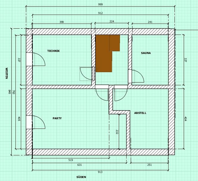 Das große Kellerzimmer soll als Partyraum dienen, in dem ein Billardtisch und eine kleine Bar Platz findet. Ebenso soll im Keller der Raum links oben später als Sauna genützt werden können. Deshalb ist dort ein Starkstromanschluss berücksichtigt.