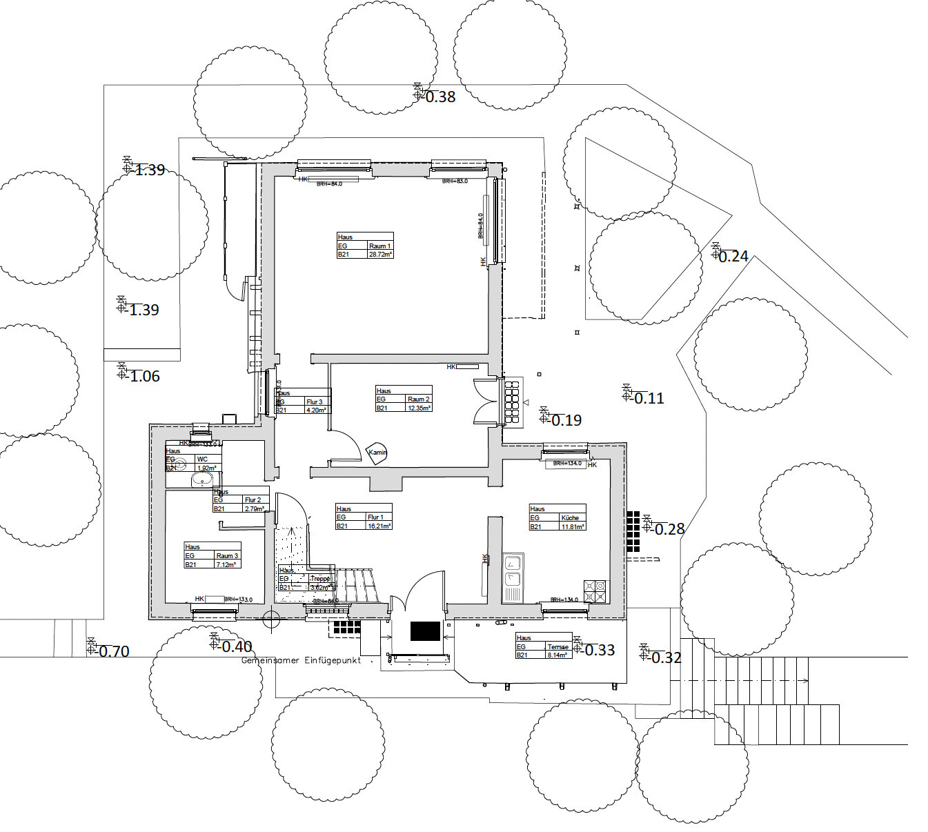 In dem beigefügten Grundriss der Bestandsaufnahme sieht man das aktuelle "Kaminzimmer" und das Wohnzimmer, getrennt durch einen kleinen Flur. Im Kaminzimmer ist die einzige Terrassentür im EG verbaut, daher sollte diese gut zugänglich sein