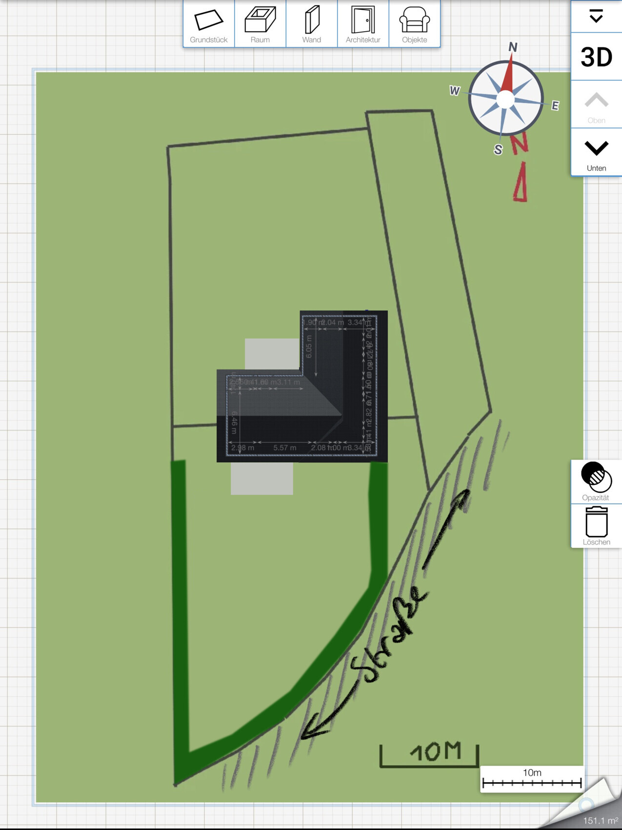Macht doch mal die Basis fertig und rund (Vermaßen des Grundstücks mit dem Einzeichnen der wichtigen Elemente) und stell das ein.