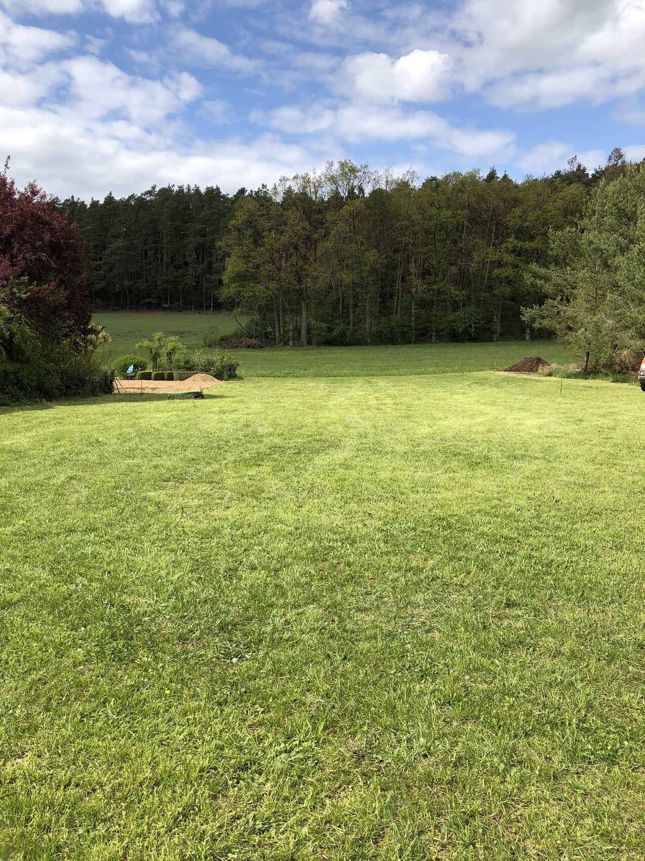 Das Baufenster ist eigentlich kein Problem, wir können das Haus stellen wie wir wollen, sofern es noch genug Abstand zum Nachbargrundstück hat. Dürften wir nicht über die grenze bauen wird entweder von vorne oder hinten direkt an die Grenze gebaut um so weit mittig wie möglich zu sein. Unseren „schönen“ Garten wollen wir auf jeden Fall nach Norden zum Wald ausrichten. Die nördliche Grenze ist hier auf dem Foto auch gut zu erkennen, die mittlere Grenze ist ungefähr bei dem Baum links mit den dunklen Blättern.