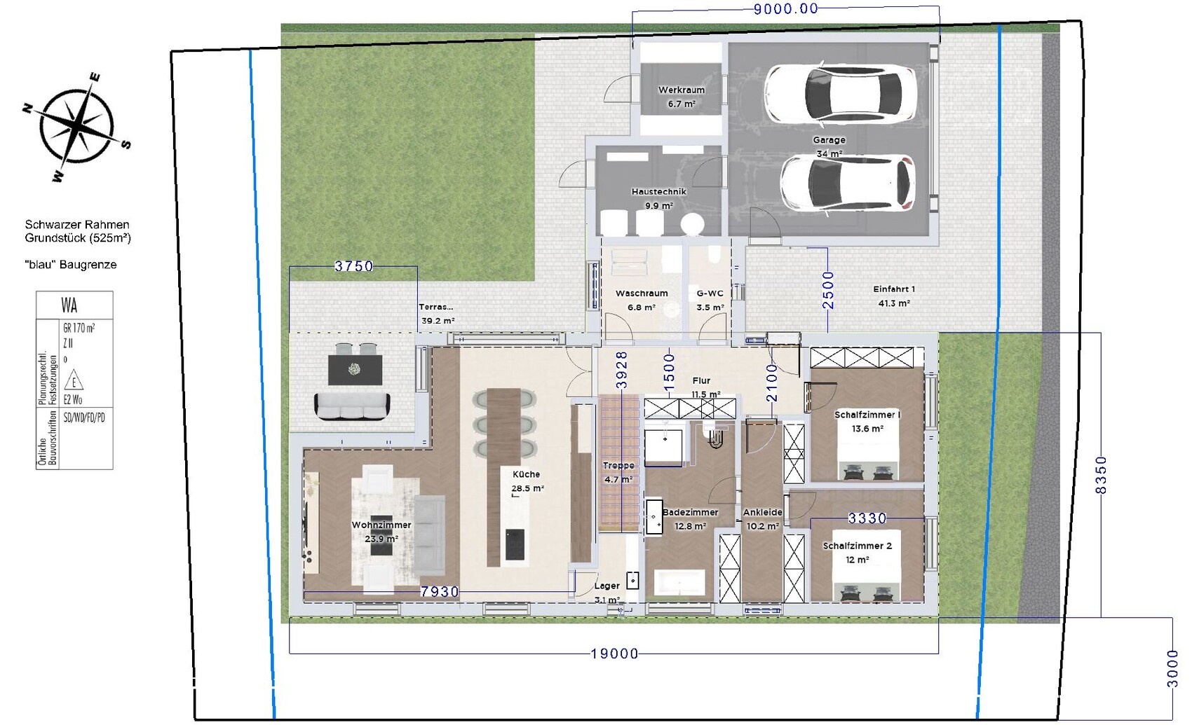 Grundrissplan eines Hauses mit Garage, Garten, Küche, Wohnzimmer und Schlafzimmer